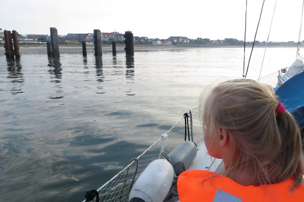 Met de punt (en dus onze benen) omhoog drooggevallen, ook nog ietsje scheef, slapen we niet lekker. Het helpt niet bij de eerste indruk van dit toch wel erg mooie eiland. De sfeer is anders dan we gewend zijn op het Oost-Friese Wad. Toeristen zijn hier duidelijk stadsmensen. We gaan Wittdün verkennen, met een kleuter met een woede-aanval. Oef. We lunchen bij een restaurantje aan achter de Noordzee-dijk en doen een rondje door het dorp. We vinden de bakker en slaan brood in. Als we terug komen in de haven zijn we moe en niet al te blij. Niet door het eiland, wel door onze slechte nacht en kleuterende kleuter. We trekken de aandacht als we de kids en de buggy weer aan boord tillen. ‘Plek 28 aan de overkant is vrij, ga daar maar snel liggen.’